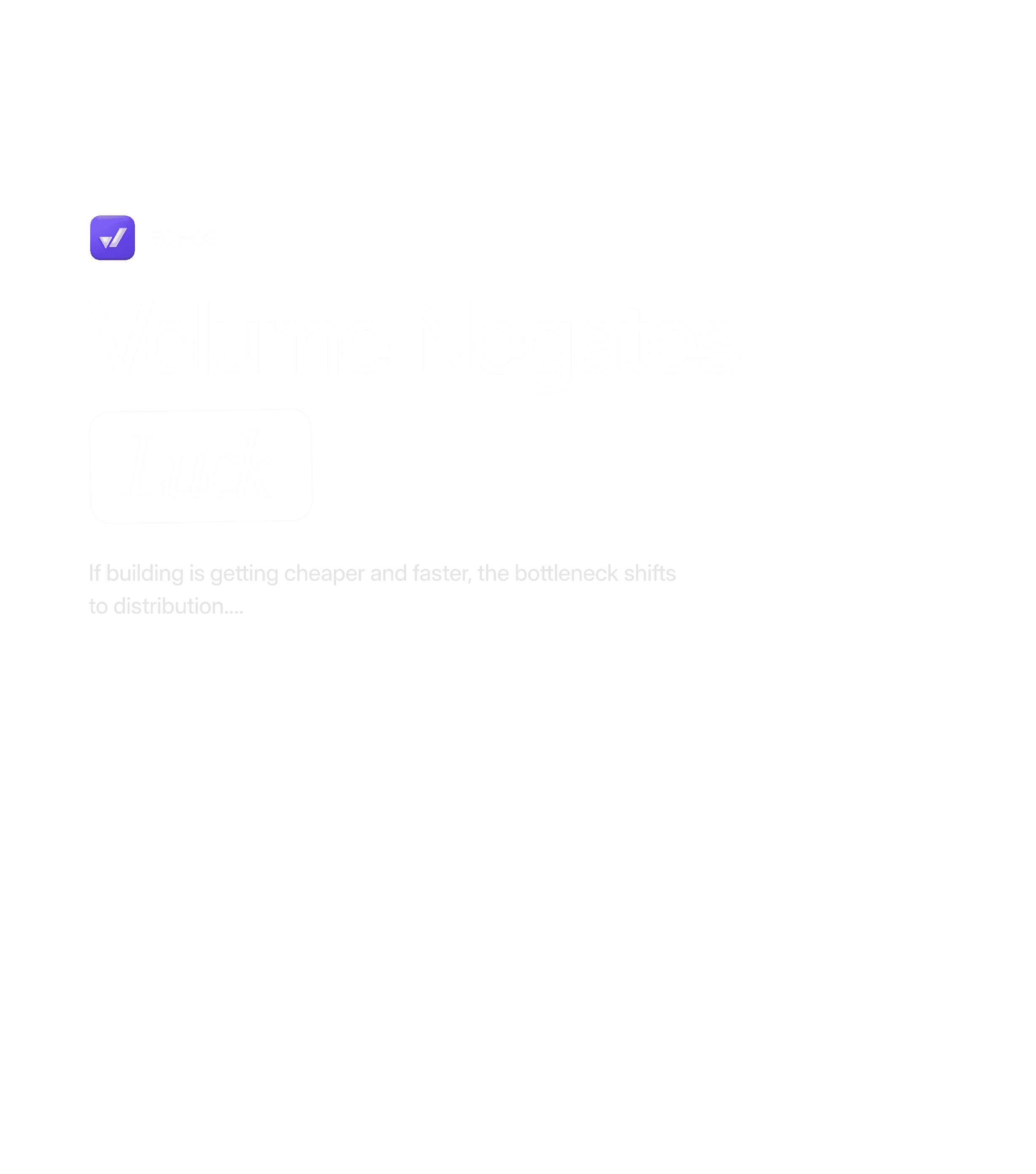 If building is getting cheaper and faster, the bottleneck shifts to distribution. viral product × insane volume = uncapped distribution, with “volume negates luck” as the operating principle.